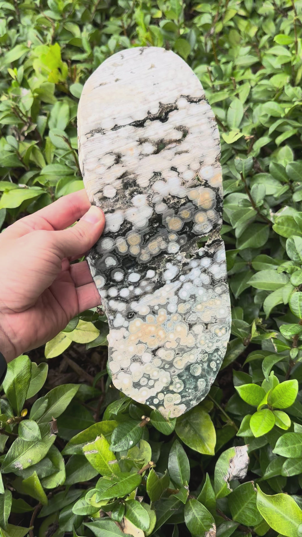 Gemstone Type - Ocean JasperGemstone Origin - MadagascarColor - Green, Gray, Black, Whiter and TanTreatment - UntreatedWeight - 578.1 gramsShape/Cut - Natural Polished SliceSize in inches - 9.5 x 7.5 x 0.25